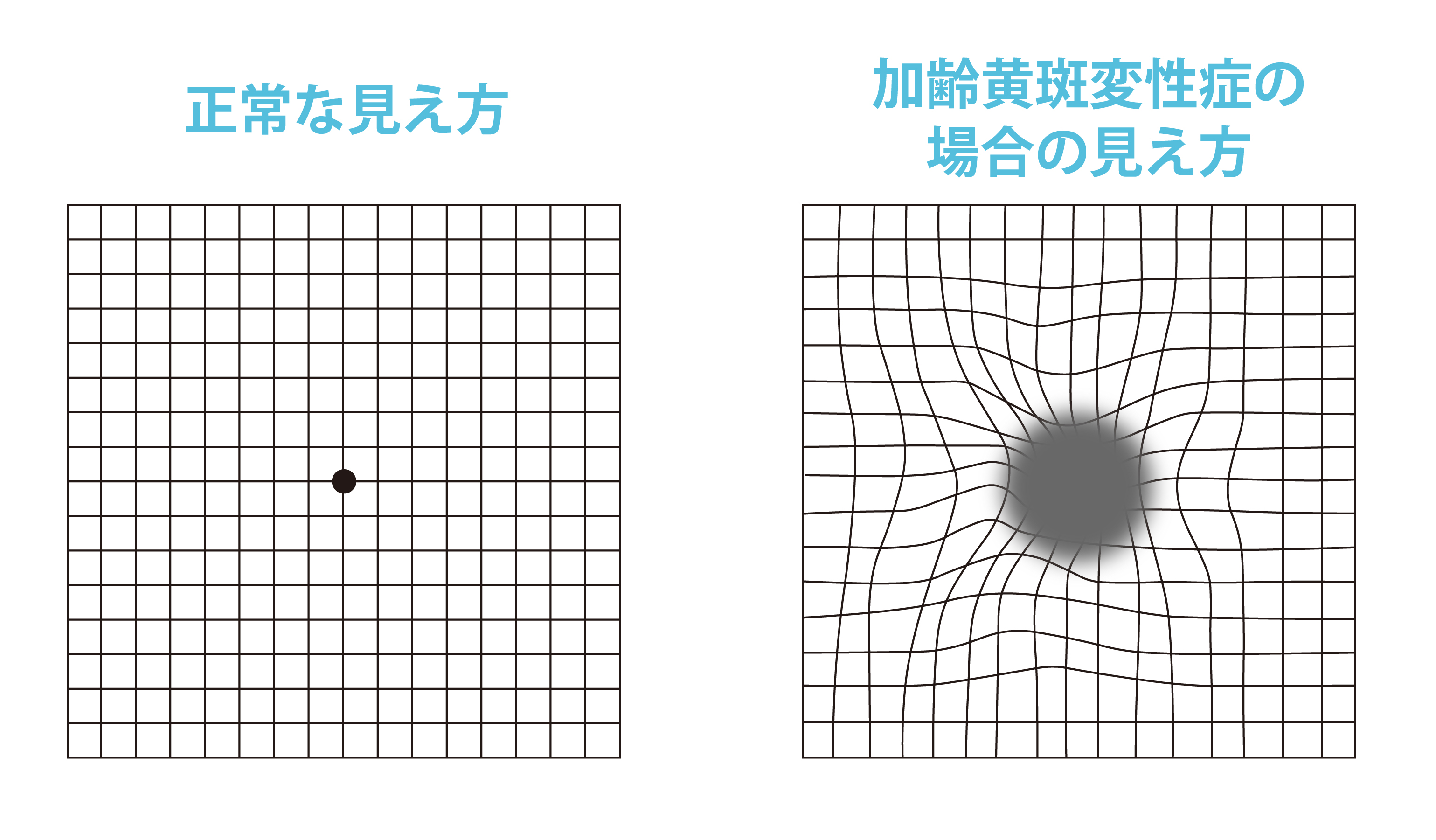 加齢黄斑変性になると、見たいところが見えない、読みたい文字が読めないなど、日常生活に支障がでます。また、その症状は進行していきます。症状として変視症(ゆがんで見える)、中心暗点(中心が暗く見える)色覚異常(不鮮明になる)、視力低下があります。